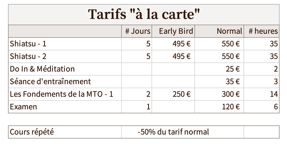 Le tarif « early bird » pour le cours Shiatsu 2 est valable jusqu’au 1er avril 2026 inclus.
